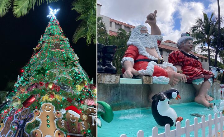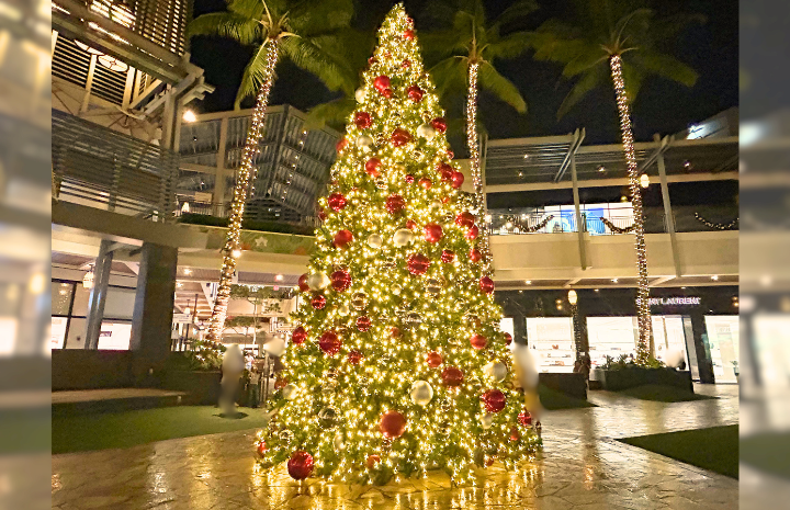 ワイキキのメインストリート、カラカウア通り沿いのヤシの木にはライトが飾られるほか、インターナショナルマーケットプレイスやアラモアナセンターなどのショッピングモールも華やかなクリスマスデコレーションで彩られます。