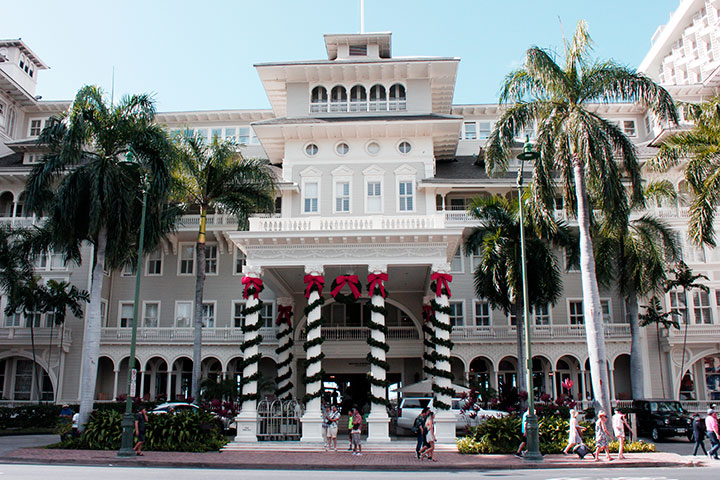 各ホテルでも豪華なクリスマスツリーやイルミネーションが施され、見応えたっぷり!中でも“ワイキキのファーストレディ”の愛称で知られる白亜のホテル、モアナ・サーフライダーのクリスマス装飾は、宿泊客はもちろん、通りすがりの観光客の目も楽しませてくれます。