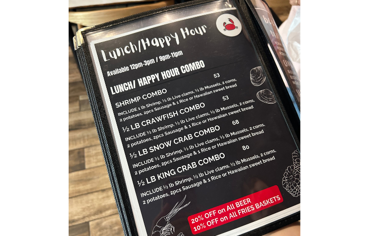 ハッピーアワーでは「海老コンボ($53)」「ザリガニコンボ($53)」「ズワイガニコンボ($68)」「タラバガニコンボ($80)」の4種類のコンボを提供。各コンボには海老・二枚貝・ムール貝がそれぞれハーフパウンド(約226g)、さらにとうもろこし2つ、じゃがいも2つ、ソーセージ2切れ、ご飯またはハワイアンスイートブレッド2つが含まれ、2人でシェアしても満足できるボリュームです。