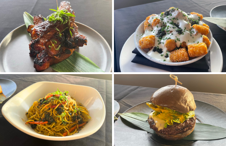 ハッピーアワーで一番人気の「テイストオブニューヨーク」($83.95)は、骨付き熟成ニューヨークサーロインステーキ12オンス、マッシュポテト、クリームスピナッチ、チーズケーキがついたお得なセット。そのほか、ミニロコモコ($12)やシーフードコンボ($26)など、様々なププ(ハワイ語で「おつまみ」の意味)や、ビール、カクテル、ワインなどのアルコールドリンクが$6から楽しめます。