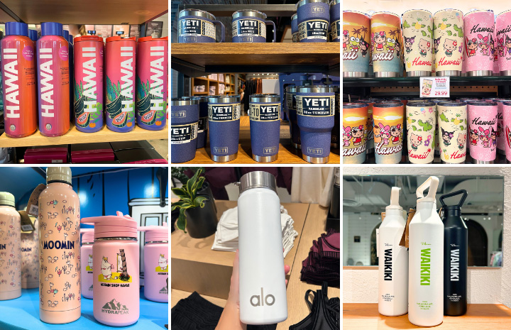 アラモアナセンター1階、センターステージ近くにあるムーミンショップ・ハワイでは、ハワイ限定デザインのボトルが販売されています。ビキニ姿のムーミンのガールフレンドが描かれた愛らしいボトルなど、ここでしか手に入らないアイテムが揃っています(小サイズ $35、大サイズ $45)。ステッカーも販売されているので、ボトルに貼って自分だけのオリジナルにカスタマイズするのもおすすめです。