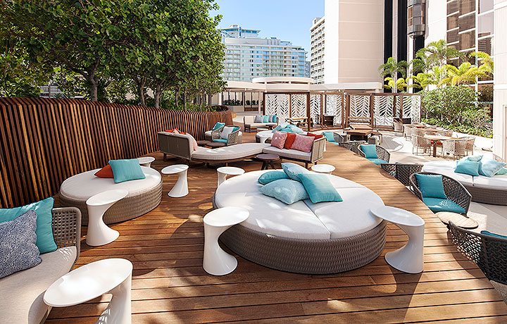 5階のプールサイドにあるヒナナバーでハワイの海風を感じながらカクテルが楽しめます。ゆったりとしたソファーが設置されたラウンジは、カップルやお友だち同士で超リラックスムードで花火を鑑賞するのに最適。サンセットライブもあり。バーは午後7時に閉まるので、ドリンクを注文して、花火が始まるまでまったりと待ちましょう。ホテル宿泊者でなくてもバーへ行くことは可能です。