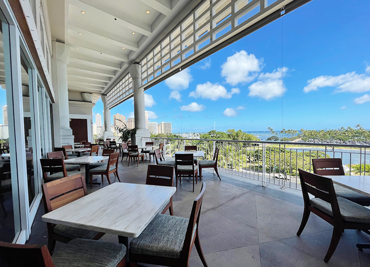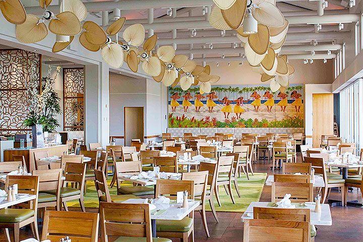 アリイタワー1階のビーチフロントという最高のロケーションに位置する、パティオ(中庭)と広々としたダイニングルームが人気のレストラン。地元の食材をふんだんに使用し、郷土料理に世界各国のテイストを導入したハワイ・リージョナル・ビーチ・キュイジーヌが提供されています。カジュアルなハンバーガーやピザも人気。毎夕方(15:00~17:00)にはライブ演奏が行われるので、早めの時間に行って花火が始まるまで食事を楽しむのも良いかも。子ども用メニューもあり。