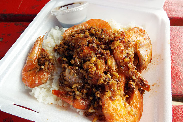 ハレイワタウンの少し手前にある、「ビッグ・ウェーブ・シュリンプ」。こちらは隠し味に出汁が使われていて、日本人好みの味と大評判。日本の芸能人も多く訪れている人気店です。