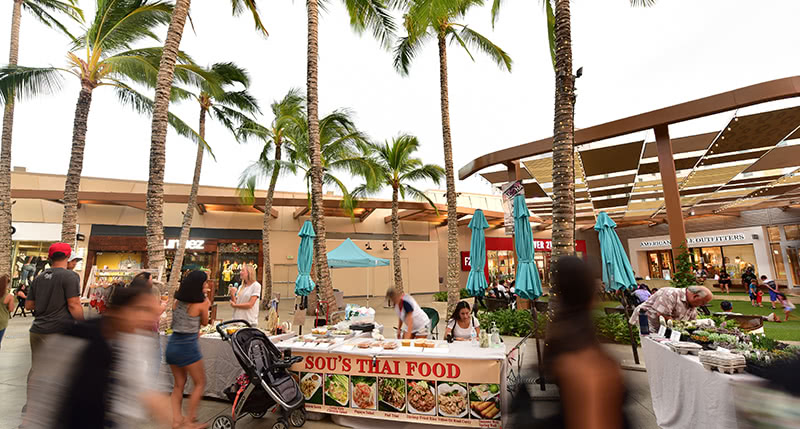 毎週水曜日と日曜日にモール内でファーマーズマーケットが開催されます。ハワイならではの美味しい料理に舌鼓。メイド・イン・ハワイのお土産を探そう!
