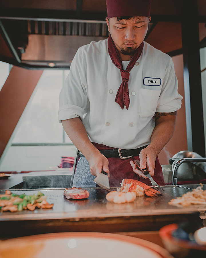 その理由というのは、ただ美味しい鉄板焼きを食べられるのではなく、シェフがナイフとフォークを自由自在に使ってパフォーマンスを繰り広げながらゲストの目の前で焼いてくれるという、欧米ならではの豪快な演出を楽しめること。日本ではなかなかできない特別な体験が出来るレストランです。