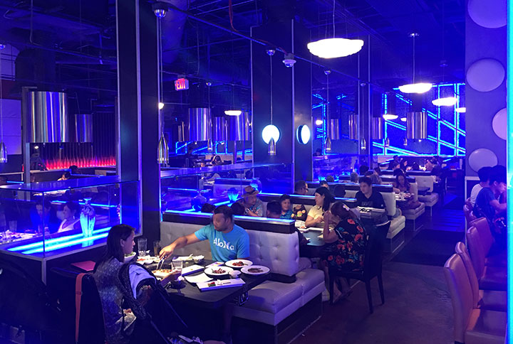 広々とした店内にはグリル付きのテーブルがズラリと並び、薄暗い中に青紫のネオンライト輝くまるで未来世界のような(!?)不思議な空間に多少動揺しつつ…お店に入ります。