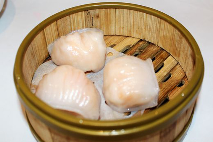 エビのチョンファン(腸粉)。もちっとした生地にエビが入り美味しいのでぜひオーダーしたい一品。具はエビの他にホタテなどもあります。(上写真)