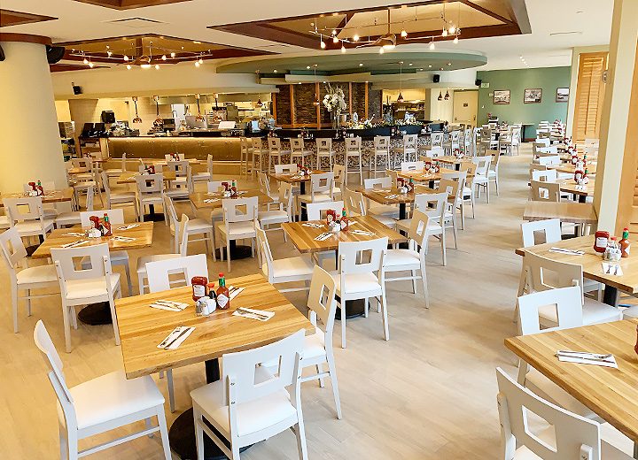 広々としたスペースには屋内と屋外合わせて計450席が導入され、朝食、昼食、夕食とテイクアウトが楽しめます。ラナイにはテラス席もあります。