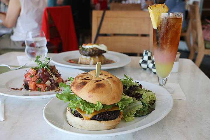 シンプルなハンバーガー「マリポサバーガー」も美味しくておすすめ。グラスフェド(牧草のみを餌に育てられた)の和牛ビーフ使用のパテにトロリと溶けたチェダーチーズ、グリルされた甘いオニオン、レタス、トマト入りのシンプルかつ豪華です。
