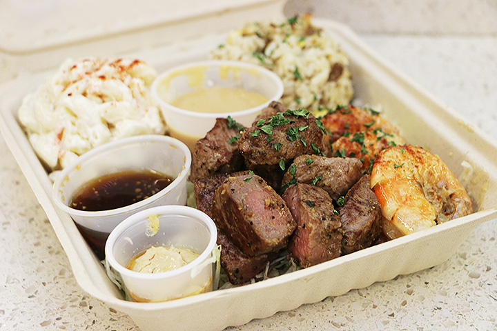 ニンニクの効いた特製ステーキと自家製ソースが自慢のお店。カウンター越しに焼いてくれる熱々のサイコロステーキが食べられる同店のおすすめは、「ステーキコンボ・プレート」($14.95)