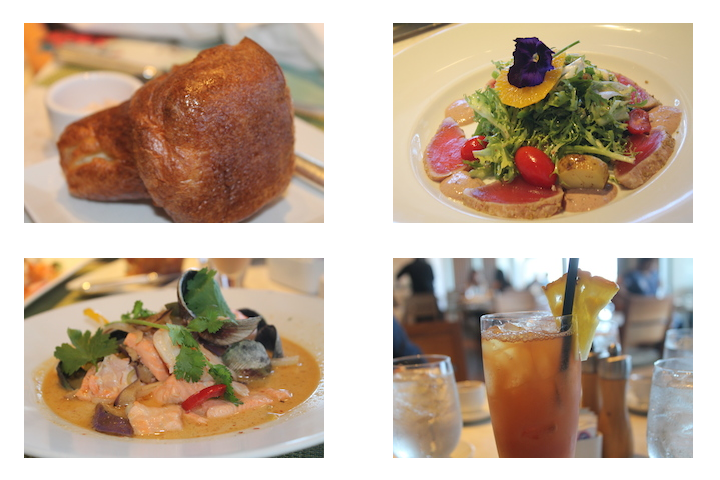 下写真の左上はメインディッシュを一皿オーダーするとついてくるポップオーバー、これがシュークリーム皮のようにふわっとしていて美味しいんです。お代わりも出来ますが、メインも美味しく味わいたいので食べすぎに要注意!