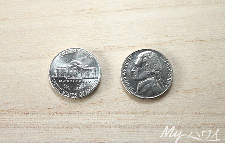 お次は5セントの「ニッケル」。色は他の2種類のコインと同じく白銀色なのですが、ふちの部分がツルツルでコイン自体も少し厚めです。