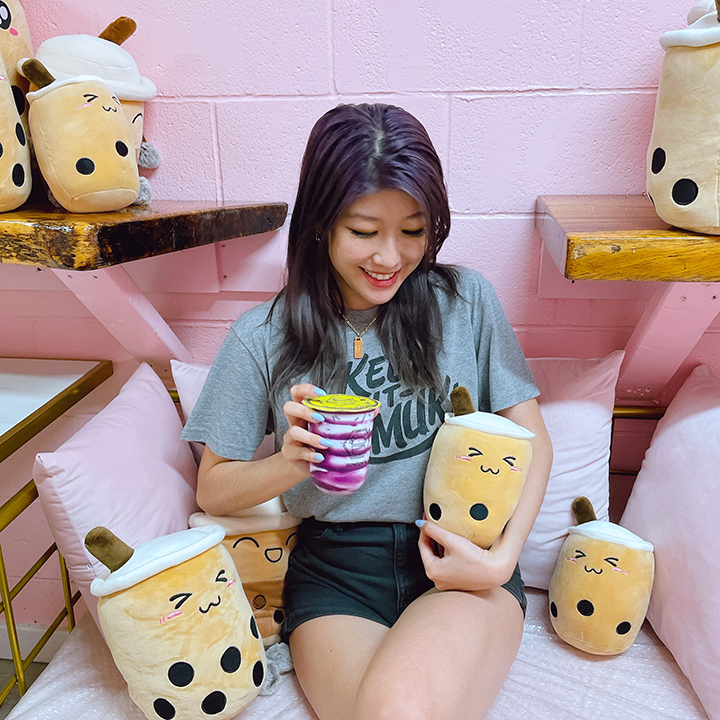 編集部員のケーシー、タピオカドリンクのキャラクターと一緒に!