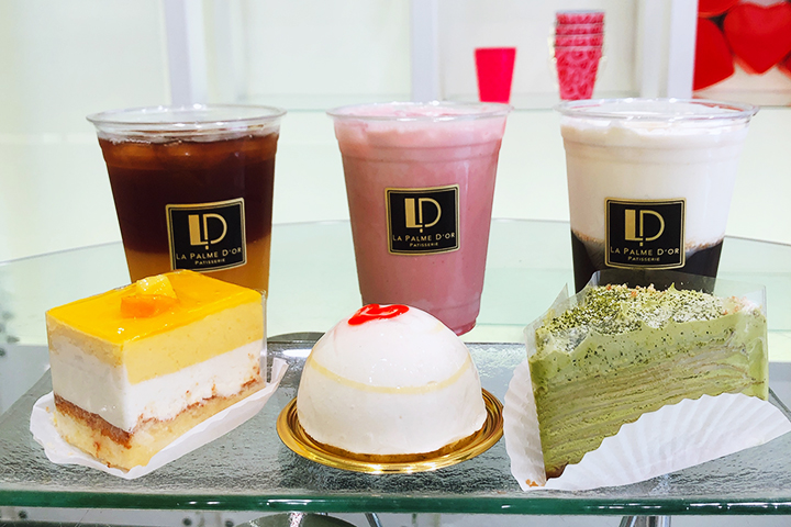 - トロピカル・フロマージュ($5)やラズベリーライチ($5.50)、抹茶ミルクレープ($6.50)など、一人用サイズからフルサイズのものまで種類も豊富で、プランテーションティー・ゼリー($5)などケーキに合わせてドリンクを選べますよ。