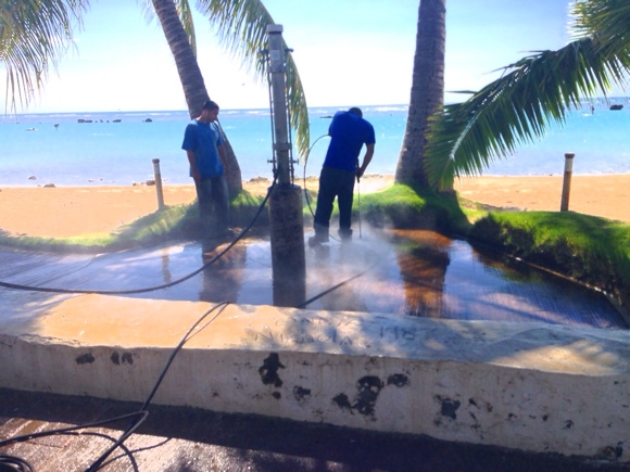 ビーチにあるシャワー、すごい噴射系のホースを持ったお兄ちゃん、棒についたタワシを持っては、ゴシゴシ!!!!!!!