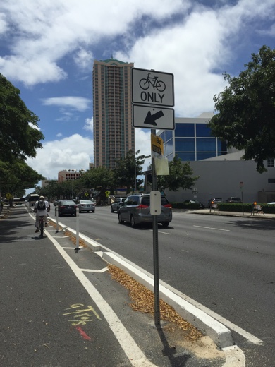 ワイキキでは自転車から降りて歩かなければいけない道や、アラワイ運河沿いの歩行者用の道も自転車禁止とか、色々あるようです。