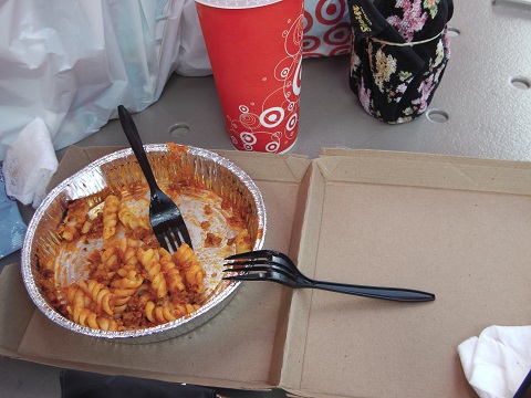 うろちょろしながら1時間半くらいあれば満足になるターゲットでいつもお迎えの時間まで待機してしまうMIHO親子です。しかし…待ち時間ですでに腹減った~(笑)ってなっちゃって、…ちょっと期待は出来ないけど、ターゲット内にあるファーストフードで空腹を満たしましょうという事でお買い上げ。。。ふむふむ、これはミート…グラタン?だね。。。うんうん、ぱくぱく…え???!