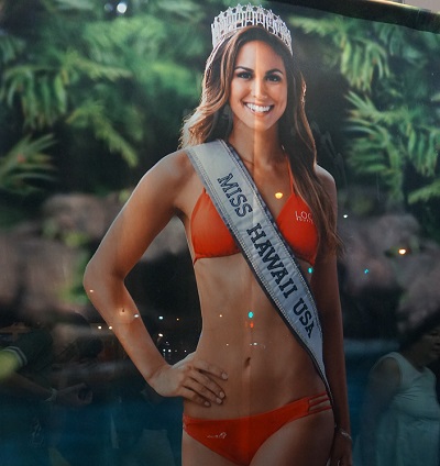 ワイキキにあるロコブティック、水着専門店のショウウインドウに目を向けると・・ななな、可愛いモデルさん?いやよくみて、彼女が斜め掛けしている勲章を!「MISS HAWAII USA」って書いてあるではあ~りませんかっ!やっぱりミスー!!!超かわいい。ロコブティックの水着は全部可愛いけど、ミスもやっぱり可愛い。今までミスの存在はアメリカ本土だけだと思ってたので、ミスハワイをディスプレイで見て知り、本土より可愛いんじゃないかと。