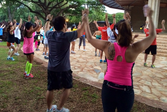 トレーニングの前ではズンバ(ラテン音楽とダンスを組み合わせたダンス・エクササイズ)でウォームアップします。 うちのランニング・グループの男性陣はダンスが苦手のようで、この時だけは後ろに引っ込んでいます。笑。