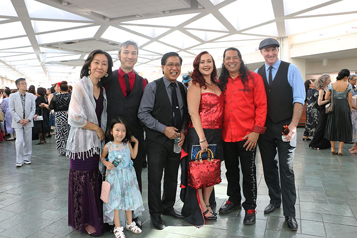 開演前のロビーではカジュアルなカクテルパーティが開催され、そこへハワイの著名なエンターテイナーが家族や仲間連れで続々と登場します。いわゆるレッドカーペット的な感じの場ですが、ハワイの場合はちょっと違っています。