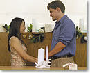 ●病める時も健やかなる時も 式の前日、教会で普段着でのリハーサルがありました。父と腕を組んで入場するところから練習をするのですが、普段、腕を組むことに慣れていない父は、主人の友人から腕の組み方を指導されていました。私は何が心配といって、牧師さんの言う誓いの言葉を繰り返すことができるかどうか、不安で仕方ありませんでした。主人よりも私に優しい牧師さんなので、少しずつ区切りながら、ゆっくりハッキリと発音してくれるのですが、ステージのように高くなっている教壇に上ると、緊張して思うように言えません。そんな不安を残しつつ、リハーサルの後は、主人の友人トム君宅でのバーベキューパーティ。トム君は主人と違うクラスだったものの、9年前は2年間、私の生徒でした。最初はなかなか「岡本先生」が抜けず、私も何だか照れくさく、実はお互いに少し気まずかったのです。BBQパーティは、あいにく雨が降ってきてしまったため、急きょ屋内での大歓談会に。特別何をする訳でもないのですが、「親戚一同、顔合わせ大会!」といったノリです。誰がどこから手に入れて来たのか、日本酒まで登場する始末。次の日が早いからと言いつつも、深夜まで騒ぎ続ける羽目になってしまいました。 |