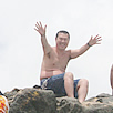 「やるぞ〜!」 「がんばれ〜」と、心配そうに下から応援するお母さん。 岩の上にずらりと並ぶ若い男の子立ちの後ろに続く一行。岩の上から眺めると案外高くで思わず腰が引けてしまいそう! こわがる子供たちを励ますために、まずはトモさんが大ジャンプ! 「よーし」と、次にはお父さんが大ジャンプ。何と岩の一番高い、上級者ポイントから挑戦です。