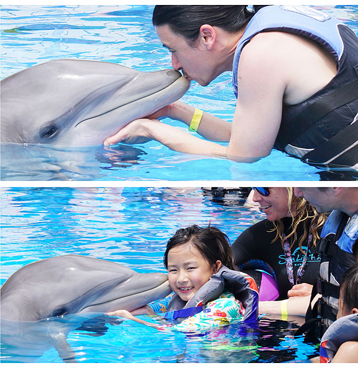 編集部員がオプショナルで選んだのは、イルカと一緒のプールに入って観察ができるプログラム「ドルフィン・エンカウンター」。フレンドリーなイルカとキスをしたり握手をしたり出来るそうで、大人も子ども同様ワクワして挑みます!