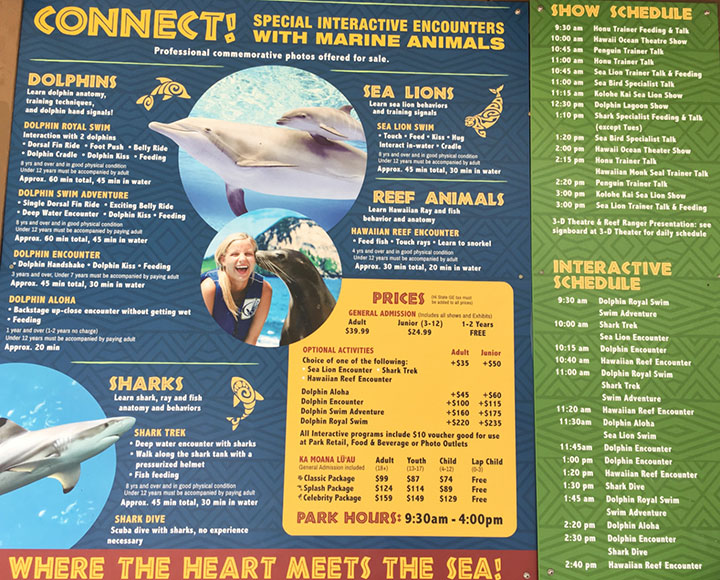 ※イルカの餌付け:ドルフィン・ラグーン・ショーの後、希望によりイルカに餌付けができます($15)。餌付け開始の15分前には販売が締め切られます。