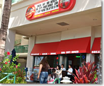 | さて、この「ビッグ・シティ・ダイナー」ですが、ローカルの家族経営のファミリー・レストランで、カイムキ、カイルア、ワード、ワイピオと、オアフ島内に4軒の店舗があります。今回お邪魔したのは、ワイキキやアラモアナ・センターからも交通の便が良い、ワード店。ワード・エンターテインメント・センターの1階にあります。 私は映画が好きで、ワード・エンターテインメント・センター内の映画館は、週1ペースで訪れているんですが、私が観たい映画は大体夜の8時ごろか、10時ごろから始まるんですよね。なので、時間をつぶしがてら、ここのレストランでディナーを食べることが多いんです。何せ、映画館の真下なので、最初にチケットを買っておけば、映画が始まる5分前まで、ゆっくりと食事を取ることが出来るんですから、便利ですよね。 |