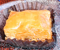 さらにデザートも食べちゃいましょう。ギリシャを代表するお菓子といえば、何はなくともバクラバでしょう。薄い薄いフィロ(パイのようなもの)が何重にもかさなり、蜂蜜がトローリと染みています。下のほうに挟まったナッツタップリのフィリングは、ちょっぴりねっちりとしたヌガーのような食感。暖められたバクラバからはえもいわれぬ芳香がただよっています。うーん、ステキ。甘さはかなり強烈なんですけど、どことなくフワッと洋酒の風味も漂い、後味は意外と爽やか。ギリシャのパパ、やるな! ちなみにこのお店、お酒は置いていませんので、飲みたい方は持参してくださいね。お気に入りのワインなど持ち込んで、ワイワイ楽しんでみませんか? というわけで、全部食べ終わった頃には、さすがの大食いクラブ部長も超満腹。お腹をさすりつつ、とっても幸せな気分で帰途につきました。ボリュームたっぷりなのに実はヘルシーなギリシャ料理、皆様もぜひ! |