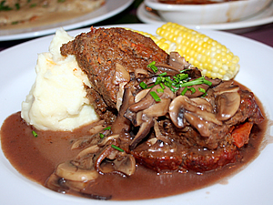 ●フライド・チキン? それともステーキ? ザ・ランチハウスのメニューはどれもこれも魅力的でなかなか決められません。ということで、シェフのクレイトンさんにおすすめ料理を作ってもらうことに。まずは、「チキン・フライド・ステーキのカントリー・グレービーがけ」。アメリカ南部の家庭料理で、チキン・フライド・ステーキという名前だけど、実はビーフ。柔らかいリブ・アイのステーキをフライドチキンのように衣を付けて揚げ、クリーミーなカントリー・グレービー・ソースを掛けたものなのです。それにしてもそのボリュームにはビックリ! 大人の手のひら2枚を合わせたくらいの大きなお肉がドーンとお皿に横たわっています。さっそく食べてみましょう。見た目とは裏腹に繊細な味で、お肉の風味がグレービーと良く合って満足感たっぷり。まろやかでやさしい味のグレービーは、さすが老舗、という味。ワンランク上の家庭の味です! |