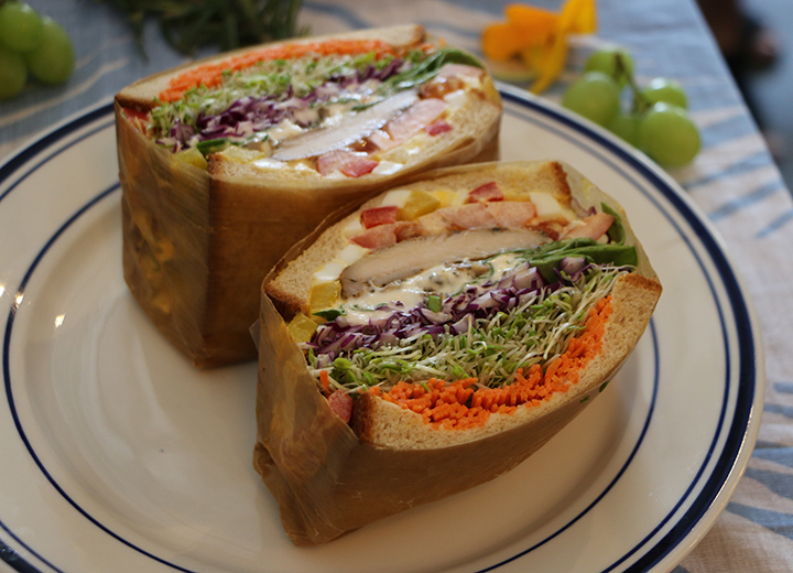 野菜盛りだくさんで栄養価が高い、ヘルシーなスプラウトサンドイッチ。こちらはグリルしたチキンとゆで卵入りでボリュームもたっぷりです。 グリルド・チキン $12