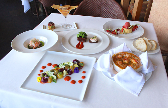 アペタイザー、サラダ、魚、肉をバラエティ豊かに用意しています。