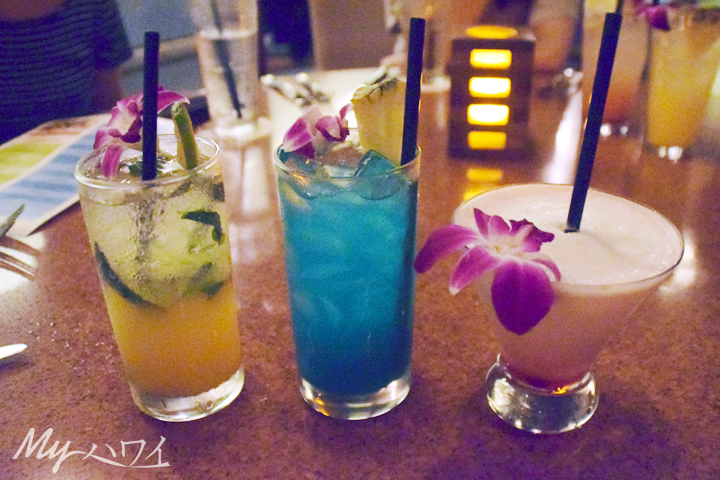 アマアマは、海に面したオーシャンビューのレストラン。半オープンエアで爽やかな風が気持ち良いのです。リゾート気分が盛り上がりますよね! 夜の海を眺めながらのディナーはとてもロマンティック。目の前のラグーンに月明かりが反射して宝石のようです。わーい、今日はカクテルを飲んじゃいますよ! カクテルメニューを見てしばし悩むのも、また楽しいところです。