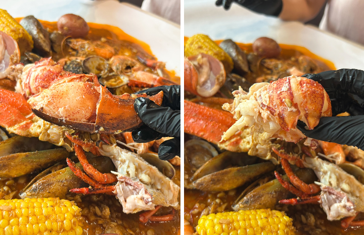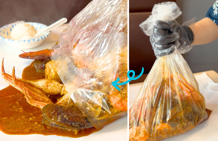 ほかほかにボイルされたロブスターやエビ、ムール貝などのシーフードが旨みを閉じ込めたまま、たっぷりのソースとともに大きなビニール袋に入って登場します。