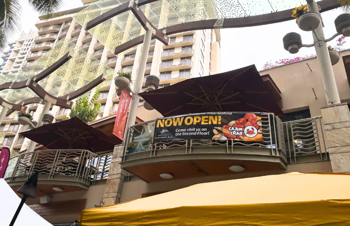 ワイキキ・ビーチ・ウォーク2階にあるケイジャン・クラブは、下から見上げると「NOW OPEN!」のサインが目印。2階へ上がるには、カラカウア通り側にあるエスカレーターを利用します。