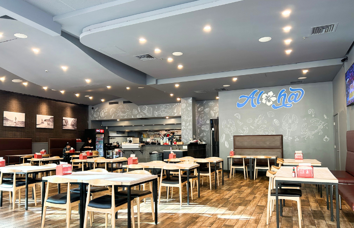 ケイジャン・クラブの新しい店内は清潔感があり、広々としていてます。Alohaのサインも描かれており、ハワイらしさも感じられます。ハイチェアの用意もあるので、子連れでも、もちろんOKです!