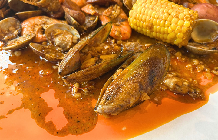 お店で一番人気のケイジャン風ガーリックバターソース。スパイスの香りと旨みが絶妙。