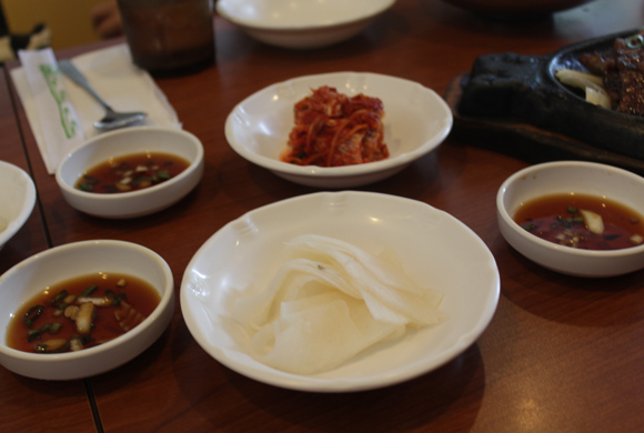 今回は女子5人プラスちびっ子1名で乗り込んだ私たち。全員が名物の冷麺をオーダーするのもなんだかなあ…ということで、お店の方おすすめの、スペシャルセットB(カルビまたはプルコギ1皿と冷麺)を2つとシーフードとキムチのパジョン(海鮮チヂミ)をオーダーし、皆でシェアする事にしました。冷麺は、みぞれスープが美味しいムルネンミョンと、汁なしタイプでスパイシーなピビンネンミョンをそれぞれ1つずつ、カルビとプルコギを1つずつと満遍なく頼んでみました。ふふふ、水も漏らさぬこの布陣! お店の方もとても親切で、あれこれとアドバイスしてくれて助かりました。