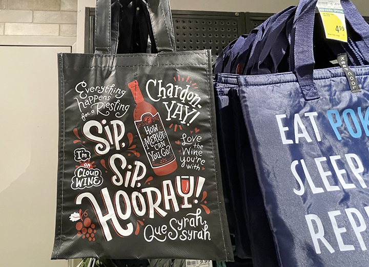 セールが行われていることも多く、取材した日はマイカイ・カード(会員カード)を使用すると$2.59でした。表と裏(上の写真)、さらには横2面もデザインがそれぞれ異なり、一袋でいろいろなイラストがあってお得な気分。ユニークな内容に、ハワイらしさもあるオリジナリティ溢れるデザインになっています。なお同じデザインで保冷バッグバージョンもありますよ(価格$4.29)。