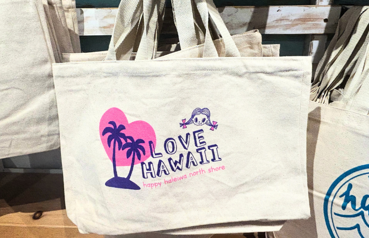 キュートな女の子のロゴマークでおなじみの「ハッピーハレイワ」にもたくさんトートバッグが販売されています。ノースショアのハレイワ店で販売されているトートバッグはこちら。