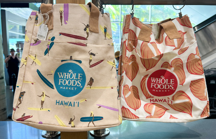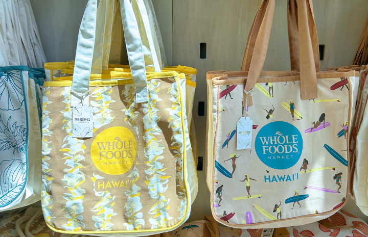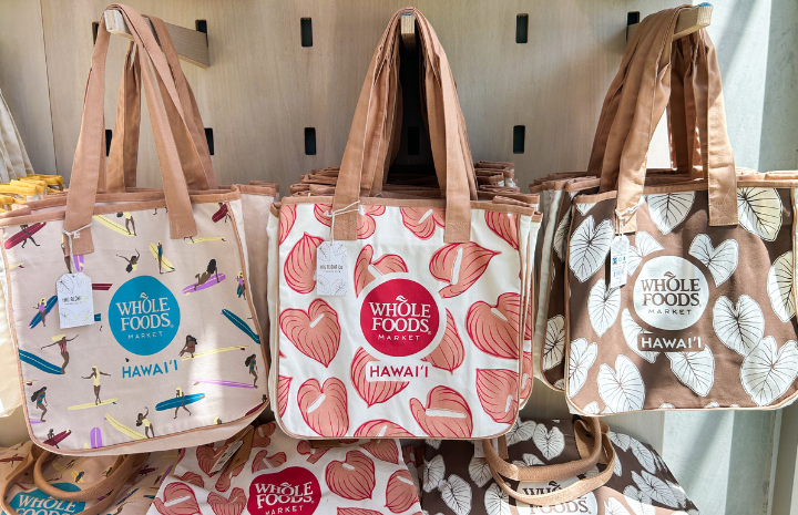 ハワイでエコバッグと言えば、まず頭に浮かぶのが、大手自然食品スーパーマーケットの「ホールフーズ・マーケット」。オアフ島では3店舗展開しており、アラモアナセンターからほど近いワードビレッジ、高級住宅街カハラにあるカハラモールの中、そしてカイルア地区にあります。旅行者もアクセスしやすい場所にあるのが嬉しいですね!