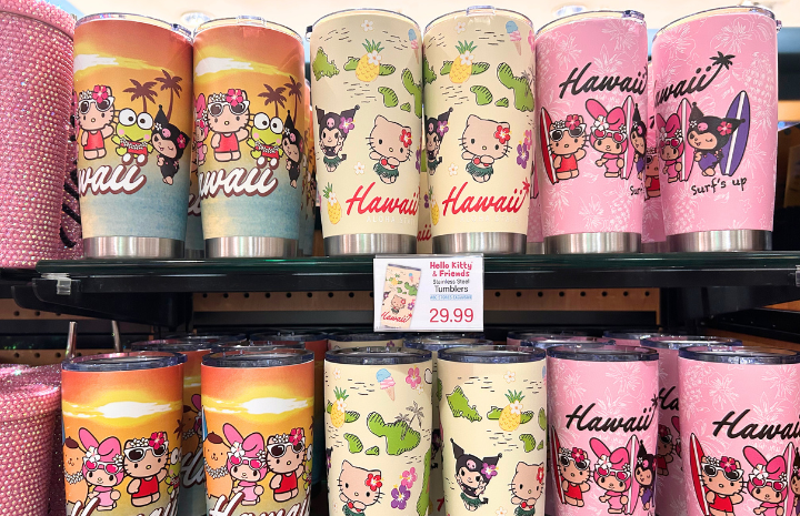 滞在中、必ず1度は訪れるABCストアでは、日焼けをしたサンリオキャラクターのハワイ限定タンブラーが販売されています。(各$29.99)