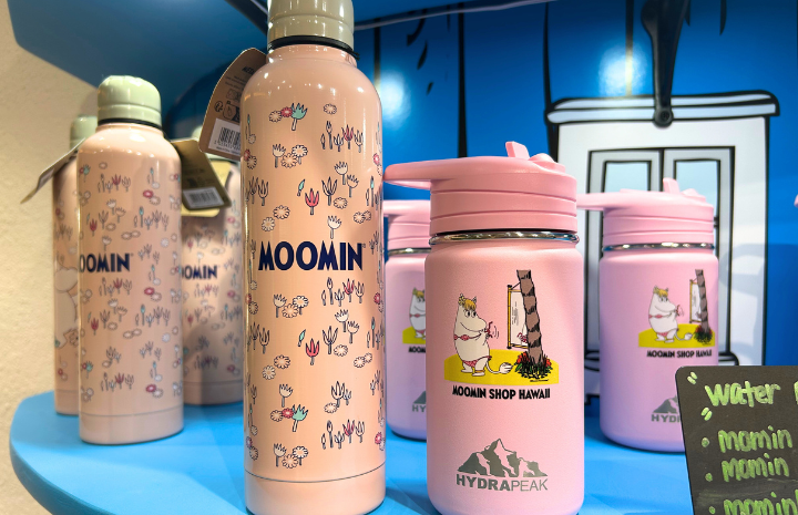 アラモアナセンター1階、センターステージ近くにあるムーミンショップ・ハワイでは、ハワイ限定デザインのボトルが販売されています。ビキニ姿のムーミンのガールフレンドが描かれた愛らしいボトルなど、ここでしか手に入らないアイテムが揃っています(小サイズ $35、大サイズ $45)。ステッカーも販売されているので、ボトルに貼って自分だけのオリジナルにカスタマイズするのもおすすめです。