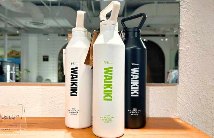 2023年のオープン以来人気を集めているロンハーマンのワイキキ店でも、ハワイ限定デザインのボトルが販売されています。 白と黒の2色展開で、「WAIKIKI」の文字が白・黒・黄緑のカラーでプリントされたスタイリッシュなボトル(各$50)。ボディには、お店が入るモアナ サーフライダー ウェスティン リゾートホテル&スパの住所も記載されており、日本に帰ってからもボトルを見るたびにハワイでの思い出がよみがえりそうです。