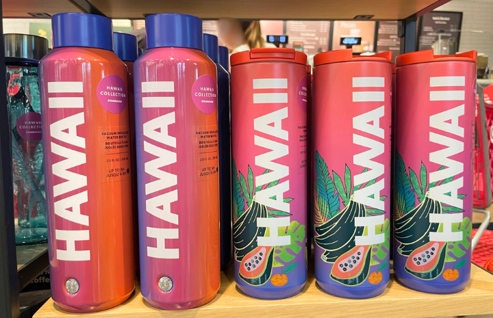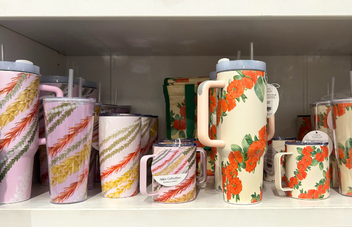 ここでは水筒ではありませんが、さまざまなタイプのタンブラーやマグが販売されています。 日本ではあまり見かけない、ハワイらしいフラワープリントが施されており、仕事や日常のシーンを華やかに彩ってくれそうです。