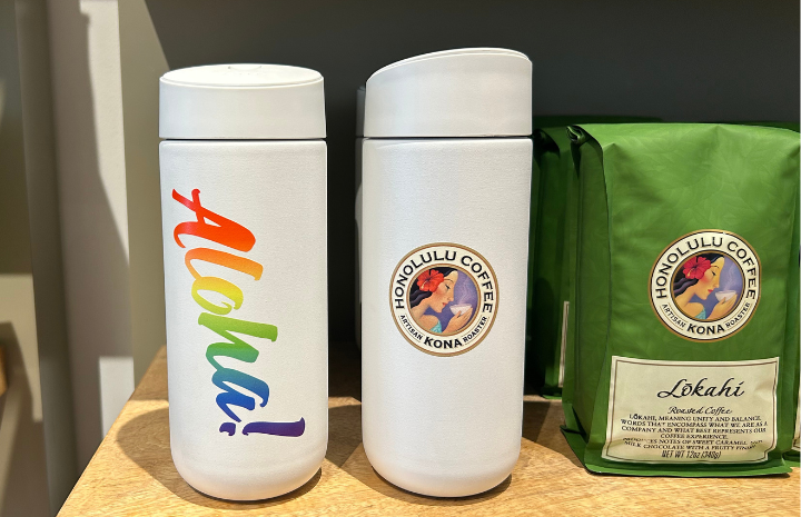 表面には、ホノルルコーヒーのロゴであるハイビスカスをあしらった女性のイラストが描かれ、裏面にはレインボーカラーで「Aloha!」の文字がデザインされたアイテム($39.95)。 そのほかにも、マグカップやエコバッグなど、お土産に喜ばれるオリジナルデザインのアイテムが揃っていますよ!