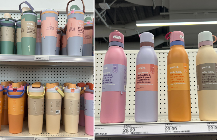 大手小売チェーンのターゲットには、アメリカで人気のボトルや水筒が多数販売されています。その一つが、オワラ(owala)のボトル。高い保冷力とポップでスタイリッシュな色展開が魅力。SNSでも話題となり、日本でもじわじわと人気が広がっています。(ボトル 各種 $29.99~)