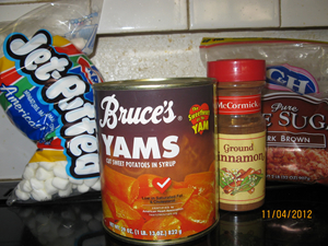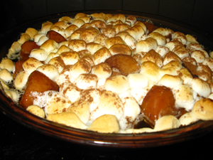 作り方: 1. オーブンを350°F(175℃程度)に熱する。 2. ちょっと深めの皿にバターを塗る。 3. ヤムをおいてブラウンシュガーを適量ふりかける。 4. マシュマロを置いてシナモンパウダーを少量ふりかける。 5. オーブンが熱したら、用意したヤムを入れて約30分くらい焼く。 6. マシュマロが小麦色になってきたらオーブンから取り出す。 7. 出来上がり!